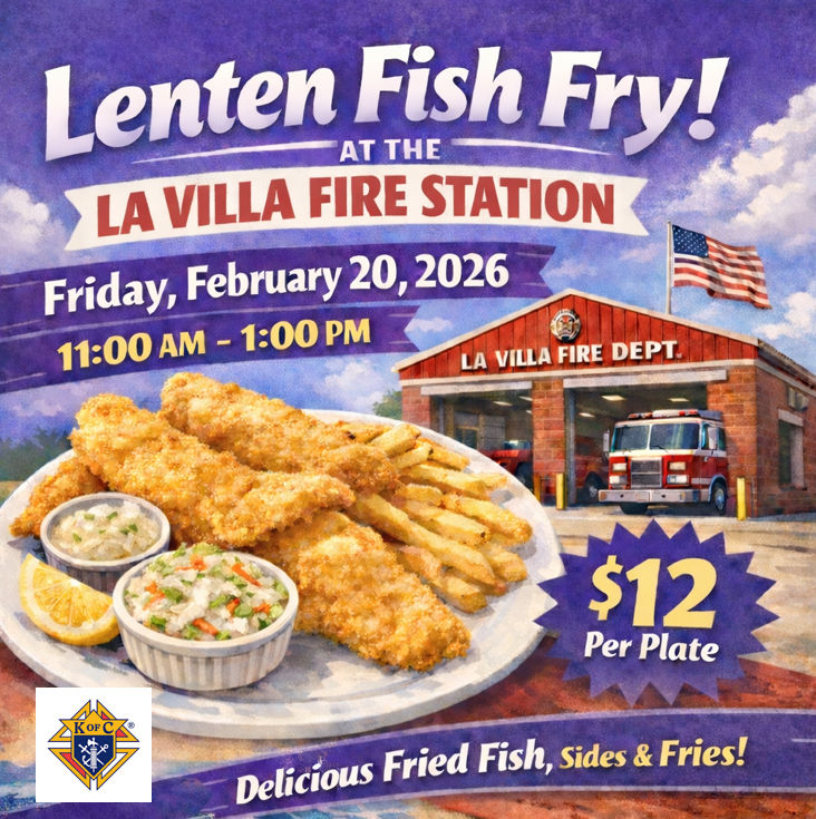 Every Friday during Lent, we will pray the Stations of the Cross at 6:00 p.m. as we walk through the streets of various neighborhoods in La Villa. This week, we will begin at the home of Iris Hinojosa, located at 201 N Laurel, La Villa, TX. We invite you to join us in this meaningful time of prayer and reflection on the passion and death of Jesus Christ.