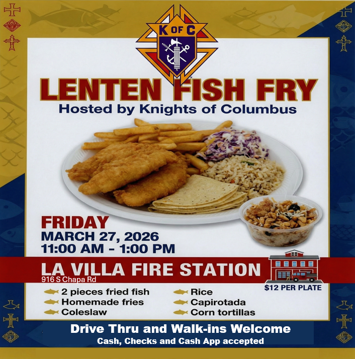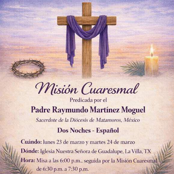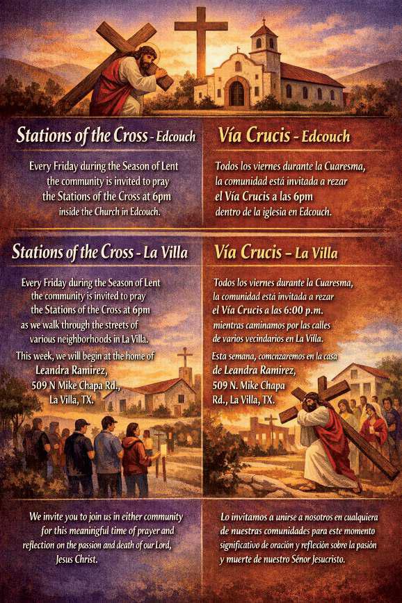 All lectors assigned to read on Palm Sunday, Holy Thursday, Good Friday, and the Easter Vigil are asked to attend a special practice on Wednesday, March 25 at 6:30 p.m. at St. Theresa Church in Edcouch. Copies of the readings will be distributed during the practice. If you are unable to attend, please contact Marissa Martinez or Mary Martinez.