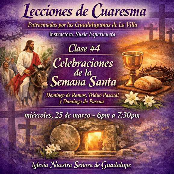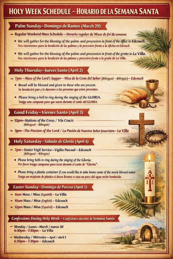Se pide a todos los lectores asignados para el Domingo de Ramos, Jueves Santo, Viernes Santo y la Vigilia Pascual que asistan a una práctica especial el miércoles 25 de marzo a las 6:30 p.m. en la Iglesia de Santa Teresa en Edcouch. Las copias de las lecturas se entregarán durante la práctica. Si no puedes asistir, por favor comunícate con Marissa Martínez o Mary Martínez.