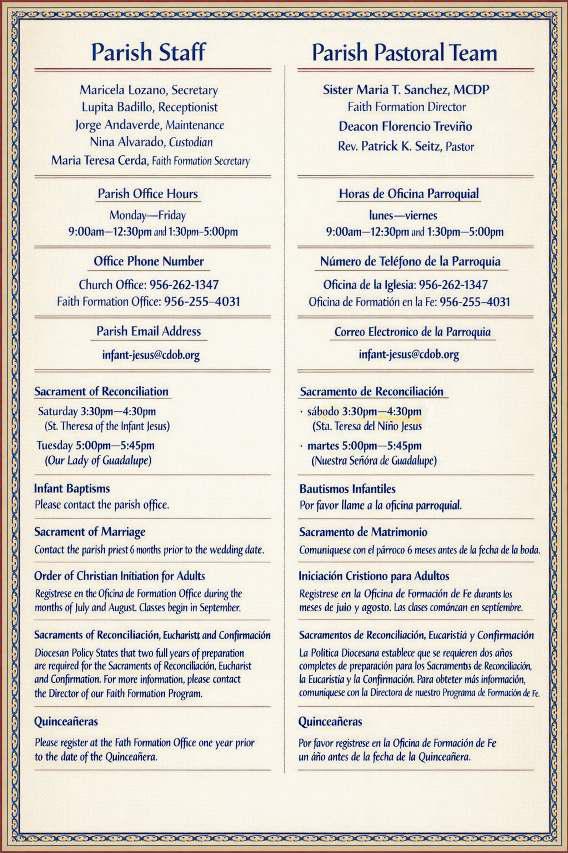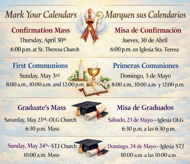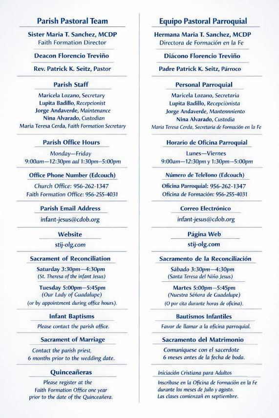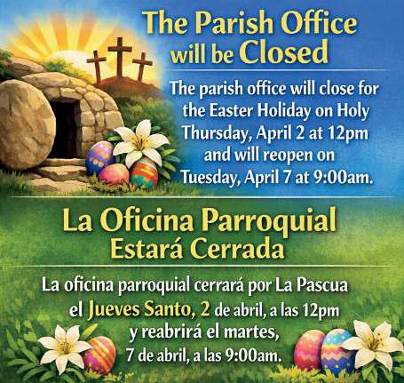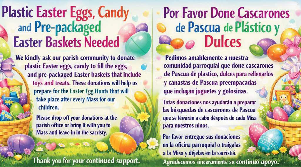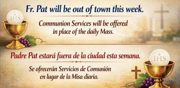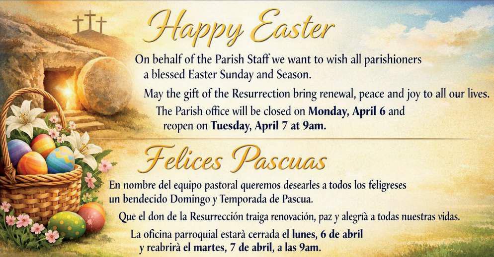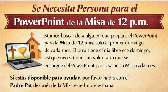Estamos buscando a alguien que prepare el PowerPoint para la Misa de 12 p.m. solo el primer domingo de cada mes. El coro tiene el día libre ese domingo, así que necesitamos un voluntario que se encargue del PowerPoint para esa única Misa cada mes. Si estás disponible para ayudar, por favor habla con el P. Pat después de la Misa este fin de semana.